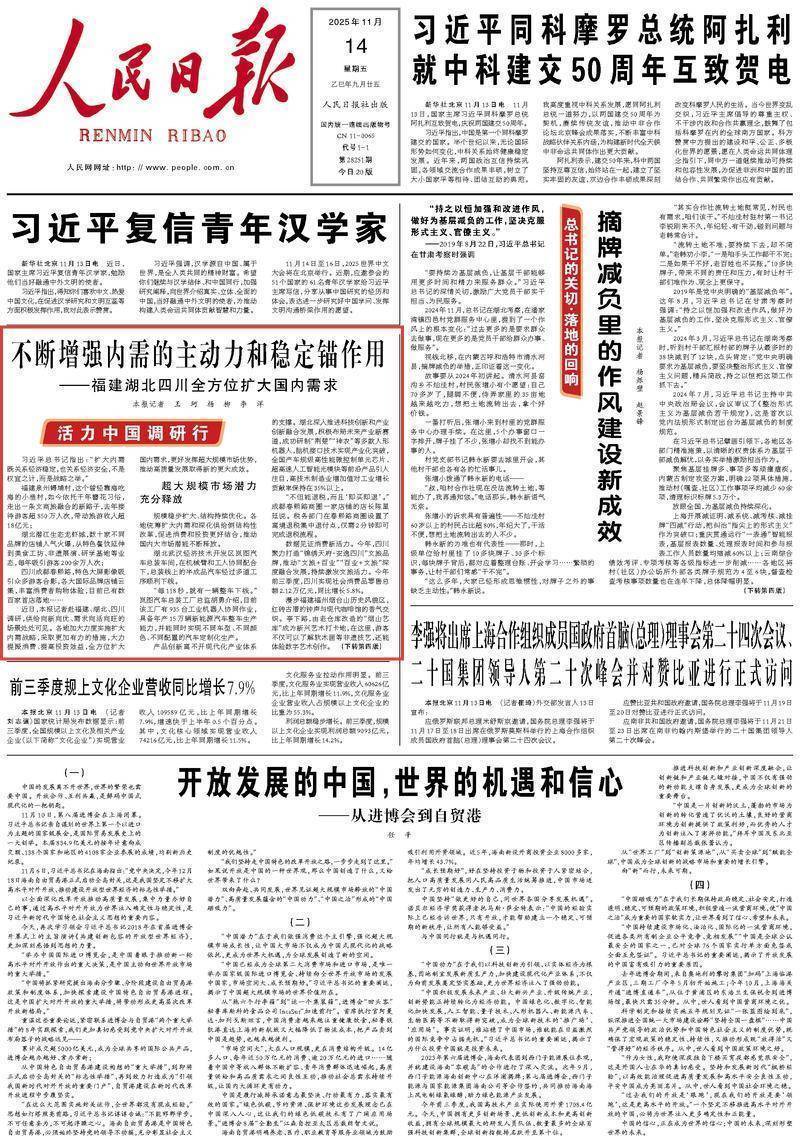 《人民日报》(2025年11月14日 第01版) 以下为湖北内容摘录 ↓↓↓ 习近平总书记指出:“扩大内需既关系经济稳定,也关系经济安全,不是权宜之计,而是战略之举。” 近日,人民日报记者赴湖北调研,供给向新向优、需求向活向旺的场景处处可见:在潜江生态龙虾城,数十家不同品牌的店铺人气火爆,从特色餐饮延伸到美食工坊、非遗展演、研学基地等业态,每年吸引游客200余万人次。 湖北加大力度实施扩大内需战略,采取更加有力的措施,大力提振消费、提高投资效益,全方位扩大国内需求,更好发挥超大规模市场优势,推动高质量发展取得新的更大成效。 超大规模市场潜力充分释放规模稳步扩大、结构持续优化。湖北统筹扩大内需和深化供给侧结构性改革,促进消费和投资更好结合,推动国内大市场潜能不断释放。 湖北武汉经济技术开发区岚图汽车总装车间,在机械臂和工人协同配合下,总装线上的半成品汽车经过多道工序顺利下线。 “每118秒,就有一辆整车下线。”岚图汽车总装工厂总监胡勇介绍,目前该工厂有935台工业机器人协同作业,具备年产15万辆新能源汽车整车生产能力,并能同时实现不同车型、不同颜色、不同配置的汽车定制化生产。 产品创新离不开现代化产业体系的支撑。湖北深入推进科技创新和产业创新融合发展,积极布局未来产业新赛道,成功研制“荆楚”“神农”等多款人形机器人,脑机接口技术实现产业化突破,全国产车规级高性能微控制单元芯片、超高速人工智能光模块等前沿产品引人注目,高技术制造业增加值对工业增长贡献率保持在35%以上。 新供给实现“量”“质”同升开发更加多样化的场景,以新供给激发新活力。湖北主动适应消费结构变化,着力增强供需适配性,积极推动经济扩容“量的优势”、提升“质的优势”。 夜幕降临,气势恢宏的湖北襄阳唐城景区流光溢彩,游人如织。结合声光电、裸眼3D投影等一系列技术,30余场唐文化节目轮番上演,让游客“边逛边赏”,在光影流转间“穿越”。 景区一角,讲解员付秀丽身着唐朝服饰,对来往游客行叉手礼。付秀丽介绍,景区是多部影视作品的取景地,白天人气很高,但一度面临“晚上客流量少”的难题。景区花大力气开发夜游项目,发掘新的消费亮点。今年上半年,景区接待游客103万人次,夜间游客占比达到60%。 湖北以“大健康、新文旅、泛娱乐、智能化”新需求为导向,实施“不夜荆楚”计划,构建“24小时不打烊”消费生态,“夜上黄鹤楼”“宜昌夜游长江”等项目受到市场热捧。2024年,全省过夜游客2.61亿人次、消费5588.49亿元,同比分别增长24.14%、26.58%,过夜游客消费在旅游总收入中的占比达62%。 “今天的湖北,正以商贸、文旅、科技、产业的融合发展,加快打造动能澎湃、近悦远来的消费新高地。”湖北省委书记王忠林表示,湖北坚持把提振消费作为扩内需、稳增长的重中之重,从供需两端协同发力,以高质量供给创造新需求,着力创新消费模式、消费场景、消费业态,努力让更多高品质、有特色的产品和服务进入市场,推动消费转型升级、扩容提质。 打造更多增长新亮点新热点国内市场空间广阔,湖北积极落实中央扩内需政策要求,深入实施提振消费专项行动,在保障和改善民生中扩大消费需求,扩大有效投资,打造更多增长新亮点新热点,实现“十四五”圆满收官。 在湖北老河口市仙人渡镇循环经济产业园,废旧产品蝶变为宝。戴上安全帽,走进顺博铝合金湖北有限公司熔铸生产车间,滚滚热浪扑面而来。去年,顺博铝合金实现产值32亿元,再创新高。 串珠成链、聚链成群、集群成势。目前,老河口市仙人渡镇循环经济产业园已形成再生铅、再生铝、再生橡胶、再生塑料等六大循环经济产业链集群。今年前7个月,园区实现产值超130亿元,同比增长近18%。 我国市场潜力大、韧性强、活力足。湖北政策举措持续推进,投资消费释放更大潜能,将更好发挥内需主动力和稳定锚作用。 人民日报记者 王珂 杨柳 李洋(人民日报记者钟自炜、李君强、刘晓宇、范昊天、游仪、李凯旋参与采写) |